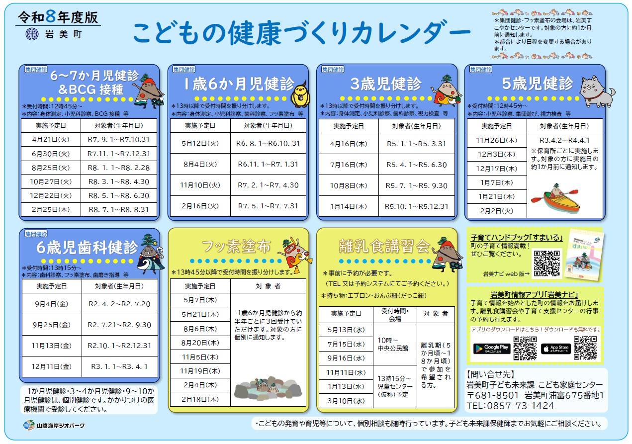 令和8年度の乳幼児健診等の日程は、以下をご覧ください。(6~7か月児健診、1歳6か月児健診、3歳児健診、5歳児健診、6歳児歯科健診、フッ素塗布の対象の方には、開催日の約1か月前に通知を送付しますので、ご確認のうえお越しください。)